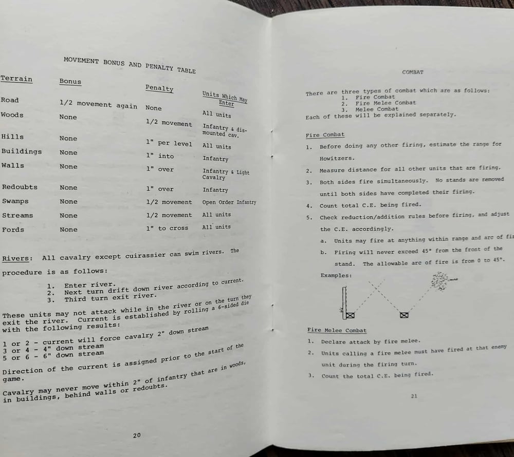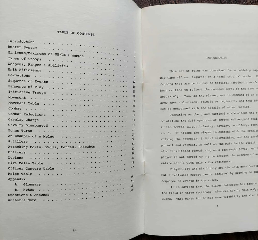 The rulebook does not contain information on how to design scenarios. Players sometimes recreated historical battles or historical what-ifs. Sometimes they played miscellaneous forces with no historical context. Many games were played as part of campaigns. “These rules are the end product of six years time, with several people’s help.”