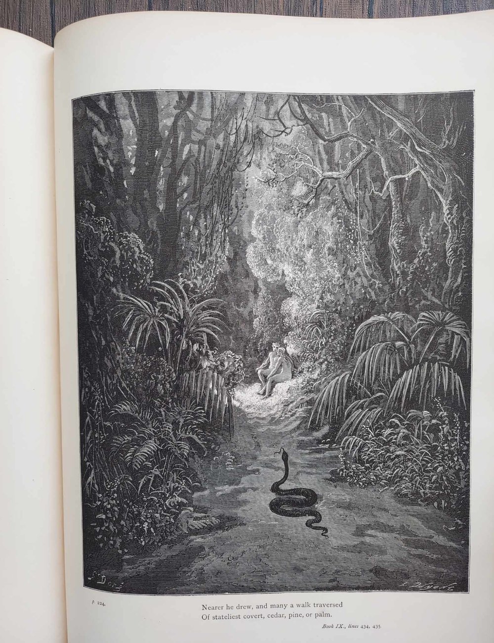 Deluxe publisher’s quarto edition of Milton’s Paradise Lost, printed by Cassell, Petter, Galpin & Co.. Includes Notes, and a Life of Milton by Robert Vaughan, D.D.. Gold gilt on cover and page ends, with silk patterned end leaves. Fifty gorgeous illustrations by Dore! A beautiful, heavy tome, approx.10.5”x13.5”x1.5”