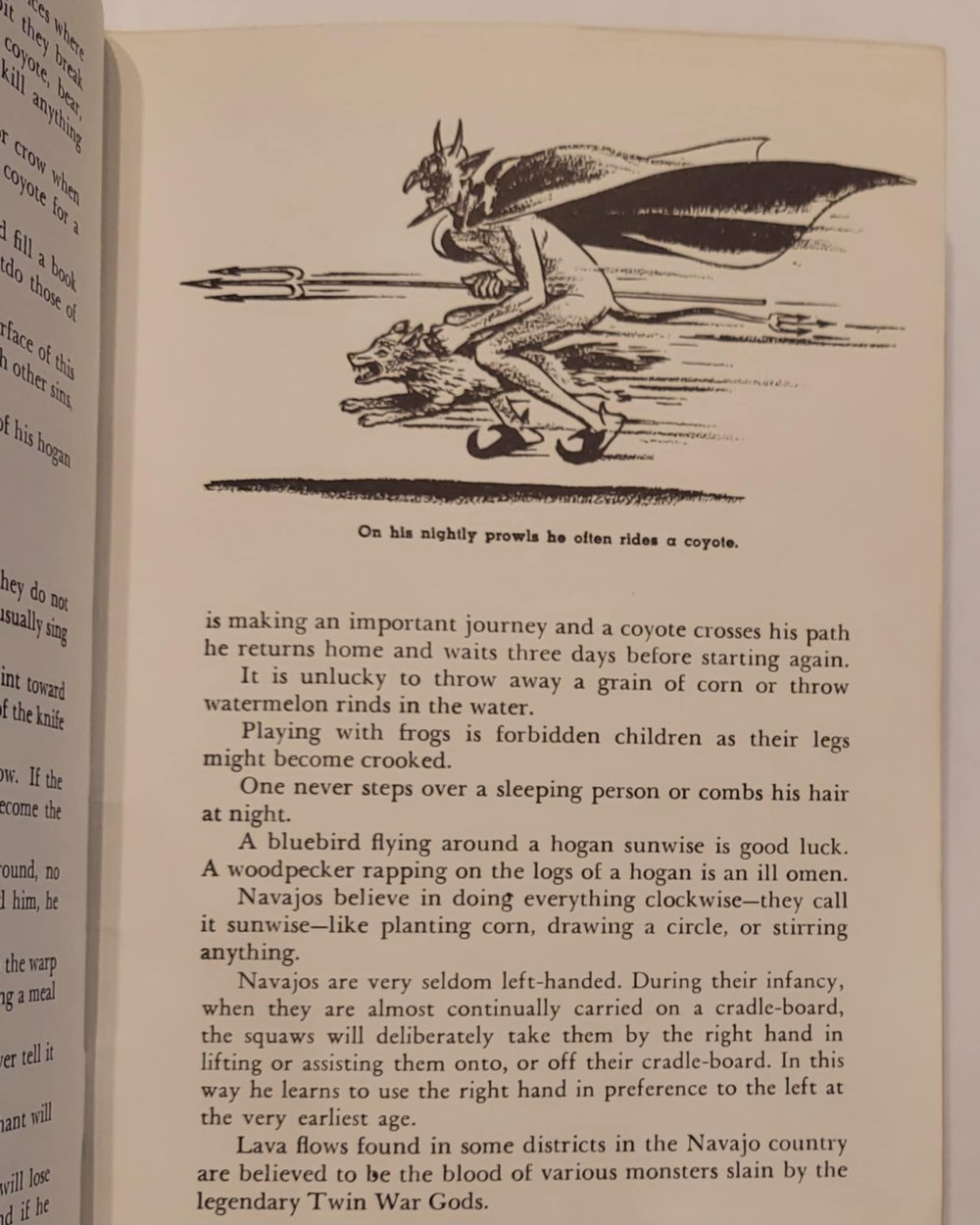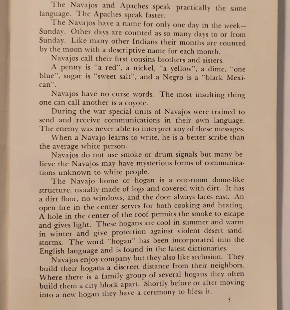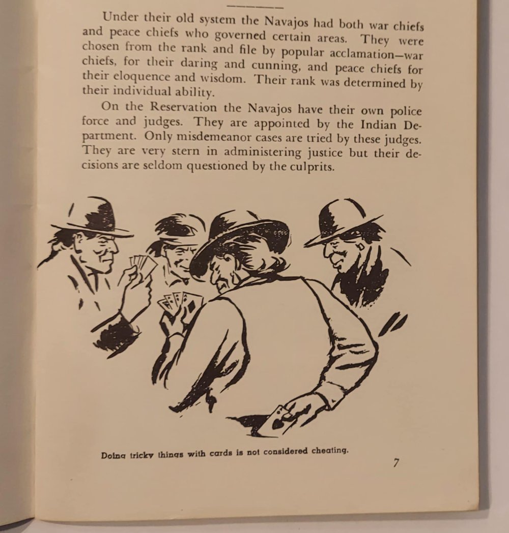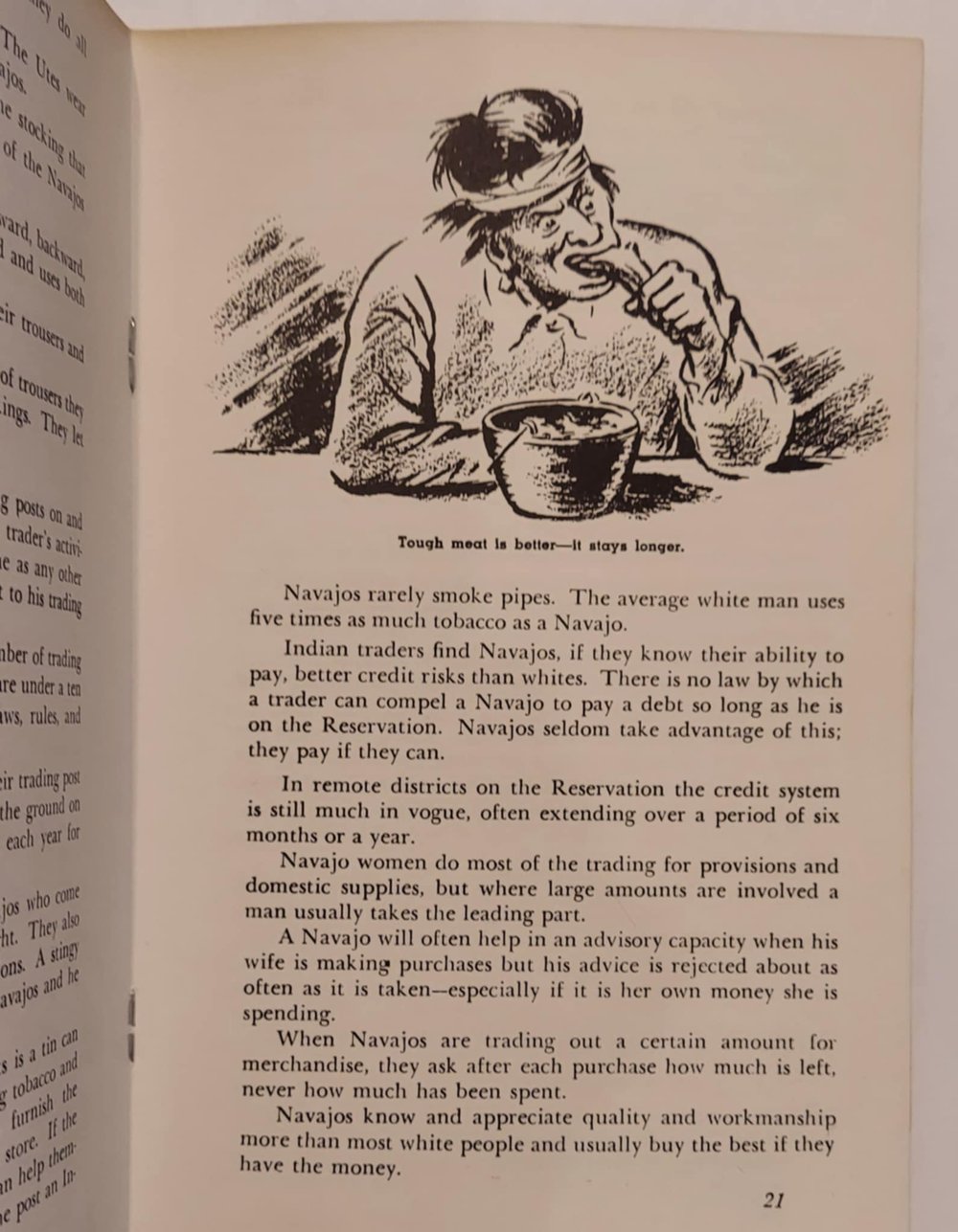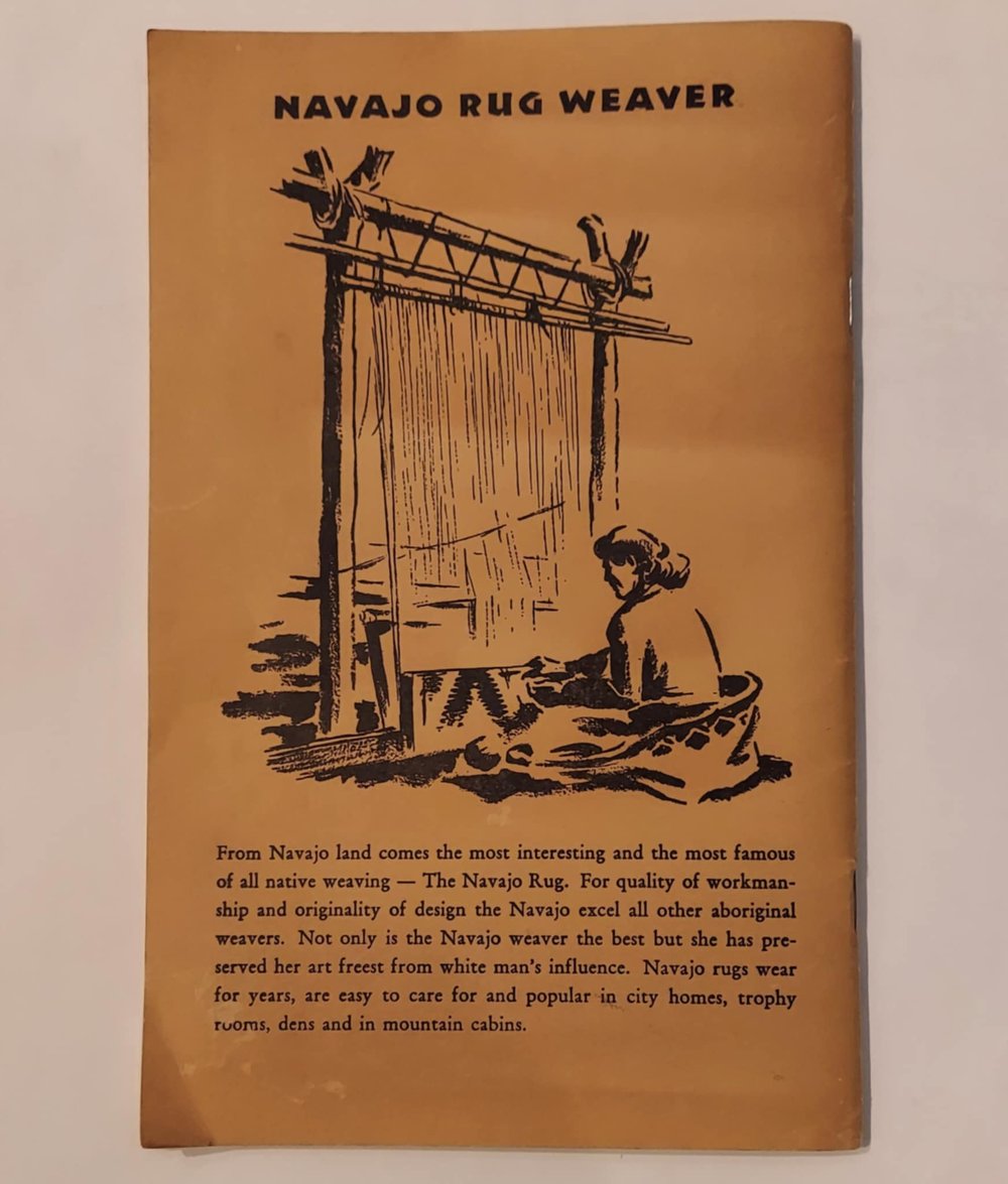 A vintage booklet, originally printed in 1949, containing 1950s Information and misinformation on Navajo history, language, rug weaving, story of turquoise, reservation life, beliefs, and customs 40 pages, illustrated with drawings.