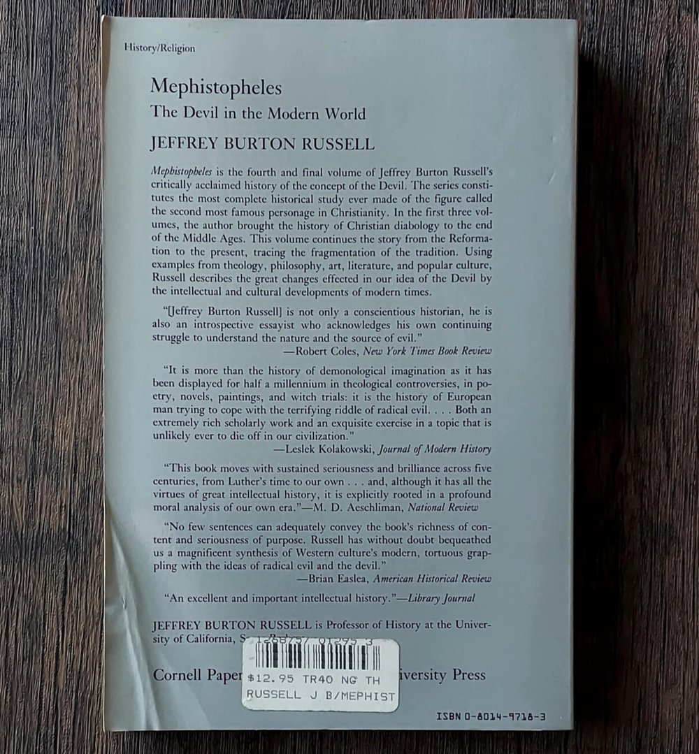 Mephistopheles: The Devil in the Modern World, by Jeffrey Burton Russell. 1990 softcover. 333 pages, very nice condition (bend/folds on the back cover).