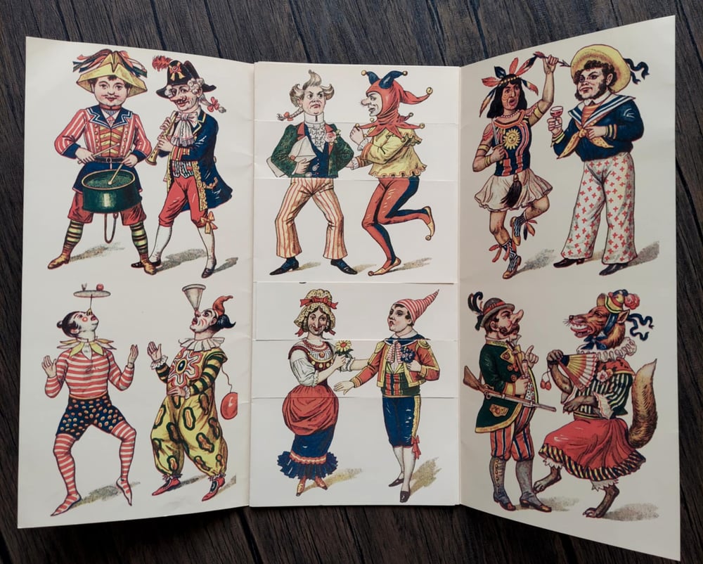 A tall 3-part foldout with an illustrated cover It opens out to reveal 3 sections, showing 6 couples, and 6 sets of moveable strips which allow the face, torso, and legs of couples to be altered. A gorgeous, interactive art book.