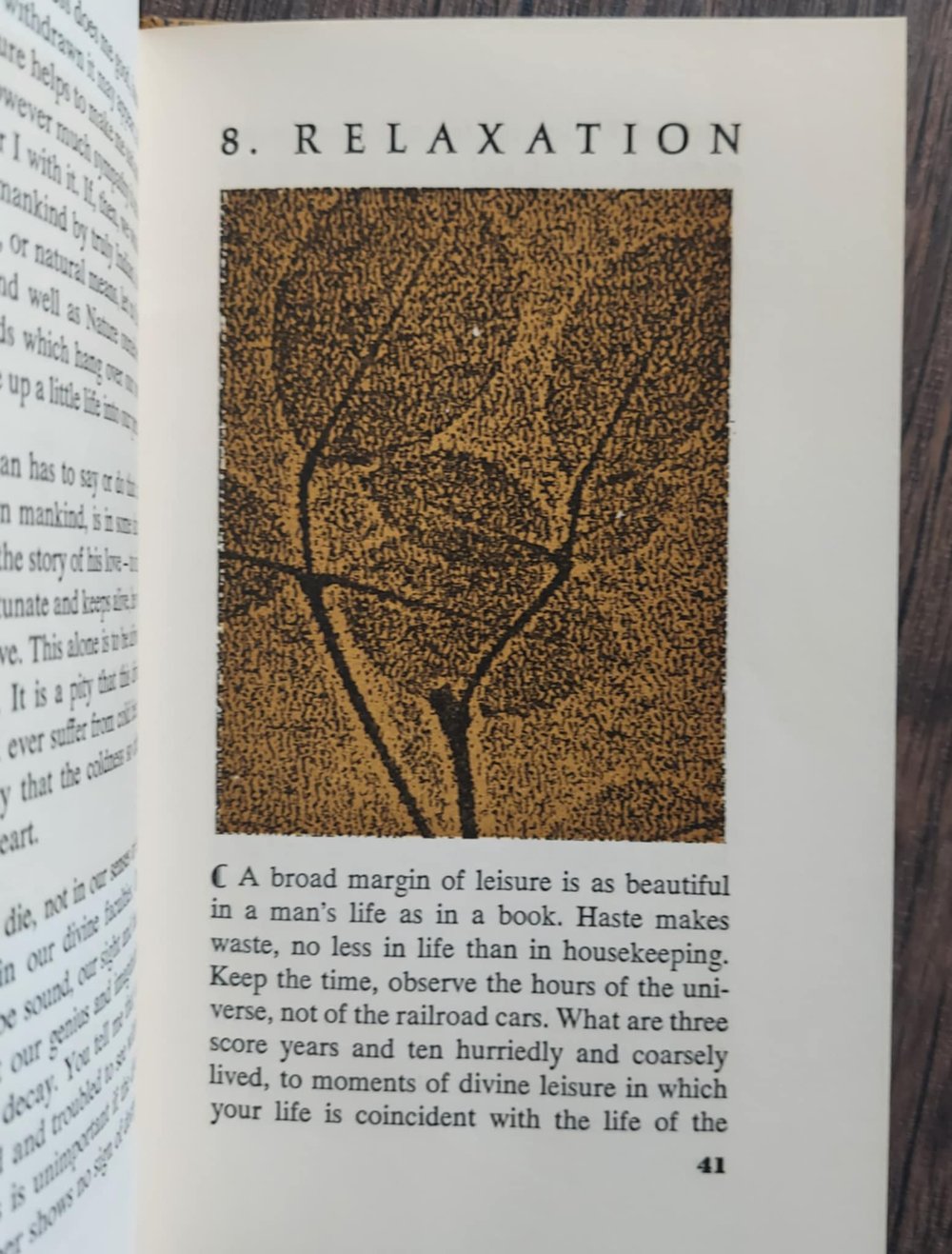 A classic Thoreau work. A reflection upon simple living in natural surroundings, and his essay, Civil Disobedience, an argument for individual resistance to civil government. Selections from the writings of Thoreau as compiled by Arthur G. Volkman are arranged in sections: 1. Alma Natura, 2. Of Aspiration, 3. Orientation, 4. Generation, 5. Mind Prints, 6. Of Courage, 7. Of Health, 8. Relaxation, 9. Re-Creation, 10. Human Faith, 11. The Great Spirit.