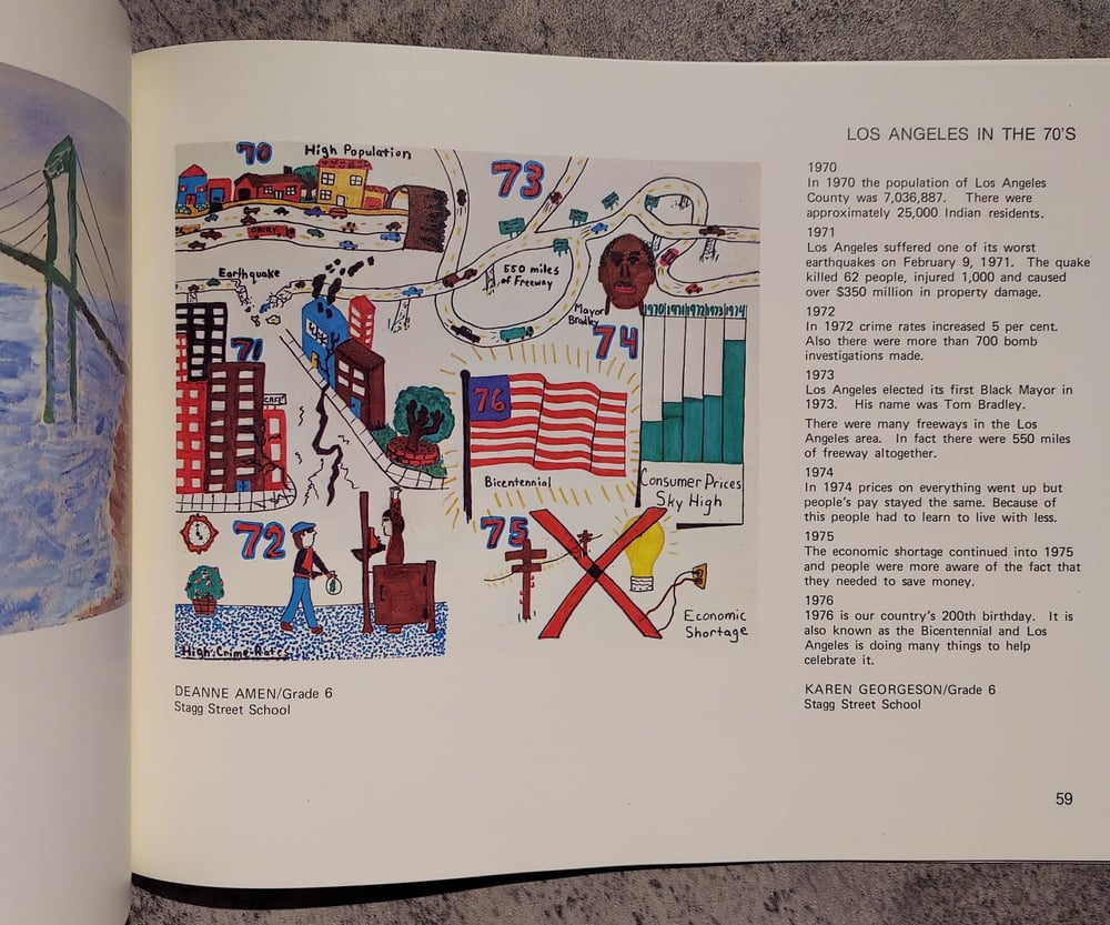 Ann art/history book created for the U.S. Bicentennial in ’76, by the Los Angeles Unified School District Bicentennial Committee. It is a commemorative project filled with paintings and illustrations from elementary school children that tell the history of LA. This one is rather difficult to find.