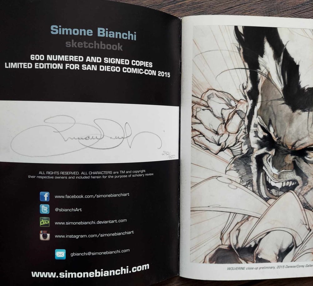 Simone Bianchi - Sketchbook San Diego Comic-Con 2015. 2015 softcover. 39 pages, very nice condition. SIGNED/Numbered #272/600.