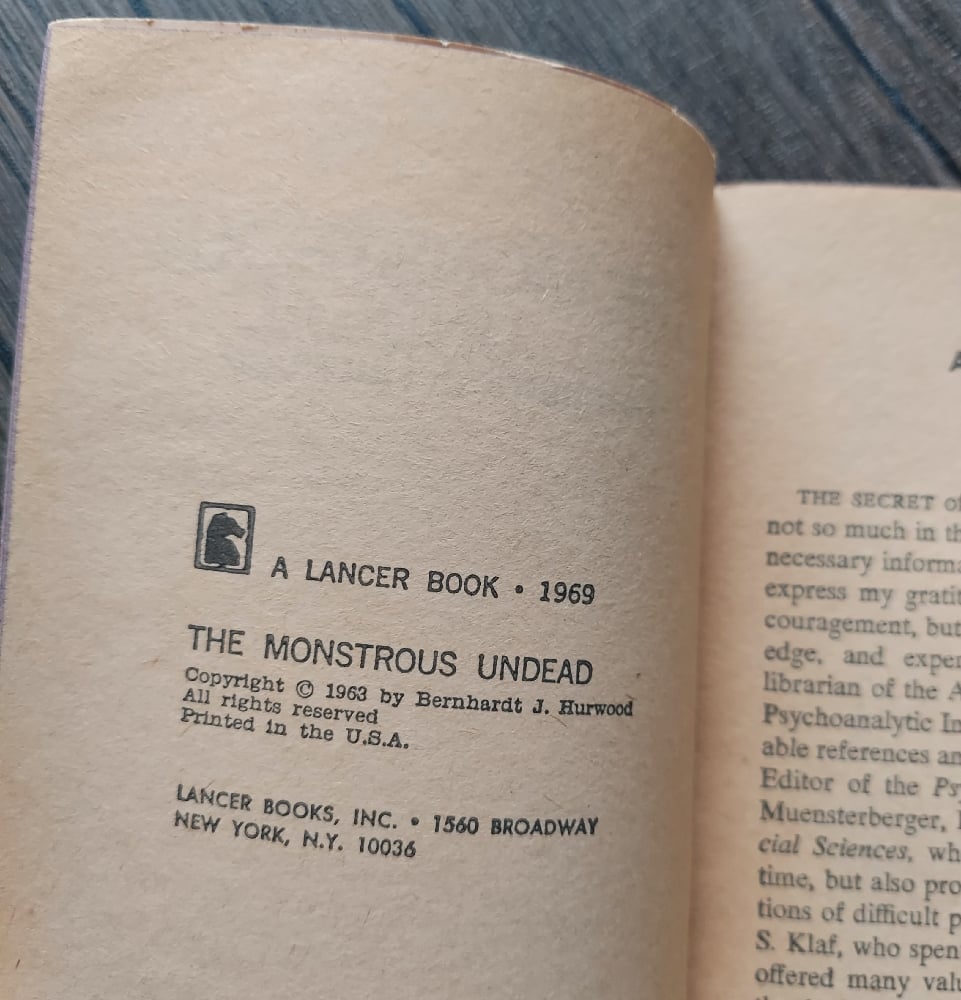 The Monstrous Undead: Legend and Fact, by Bernhardt J. Hurwood. 1969 paperback. 190 pages, very nice condition.