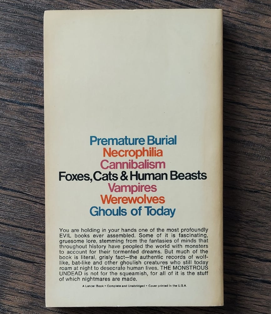 Premature Burial, Necrophilia, Cannibalism, Human Beasts, Vampires, Werewolves, and Ghouls of Today. Fascinating, gruesome lore, stemming from the fantasies of minds that throughout history have peopled the world with monsters to account for their tormented dreams. Much of the book is literal, grisly fact – the authentic records of wolf-like, bat-like, and other ghoulish creatures who still today roam at night to desecrate human lives. The Monstrous Undead is not for the squeamish, for all of it is the stuff of which nightmares are made.